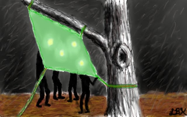 There is a river through our shelter. The fire is out, and mud has covered everything, including the corn we were just about to roast. We hold the shelter down- we are human stakes. Lightning blinds us and the crackle and roar of thunder hits at the same moment. I scream. Then I laugh.
